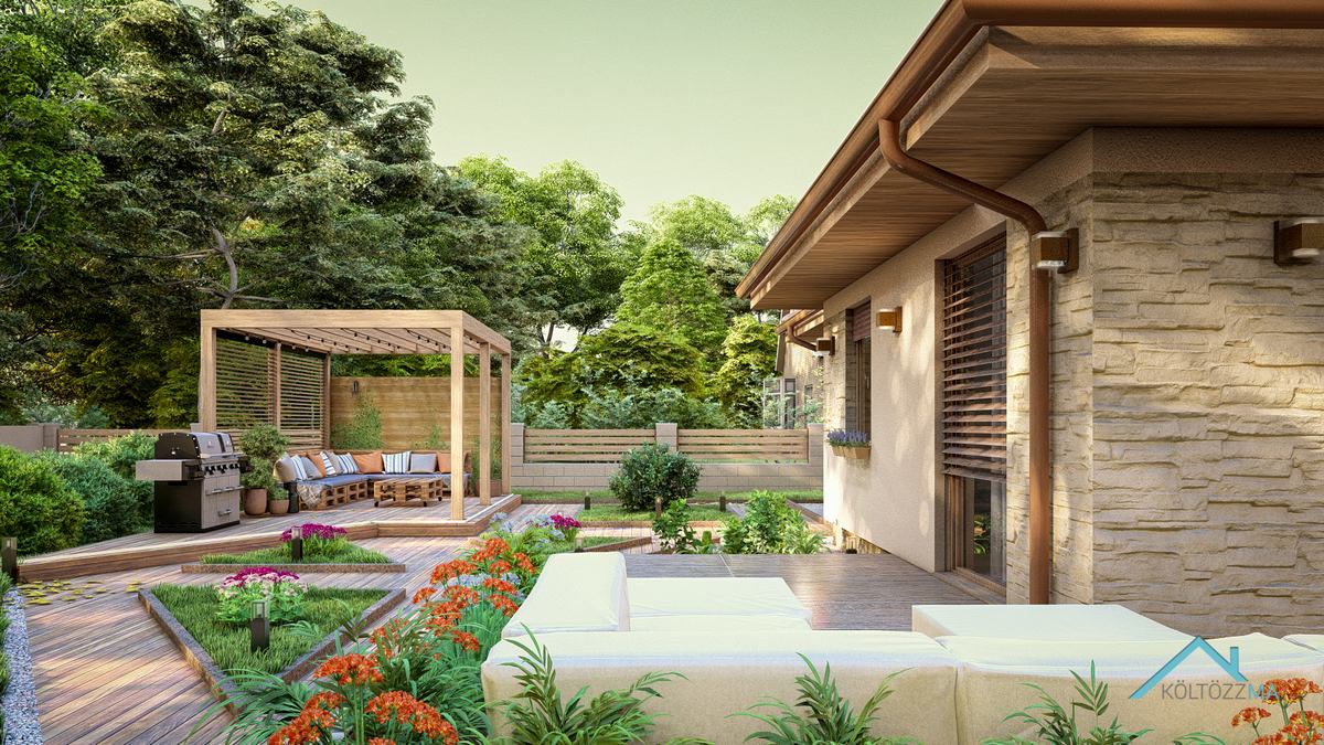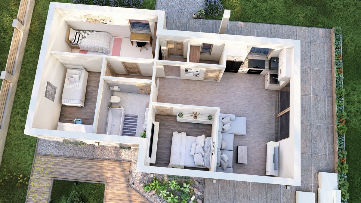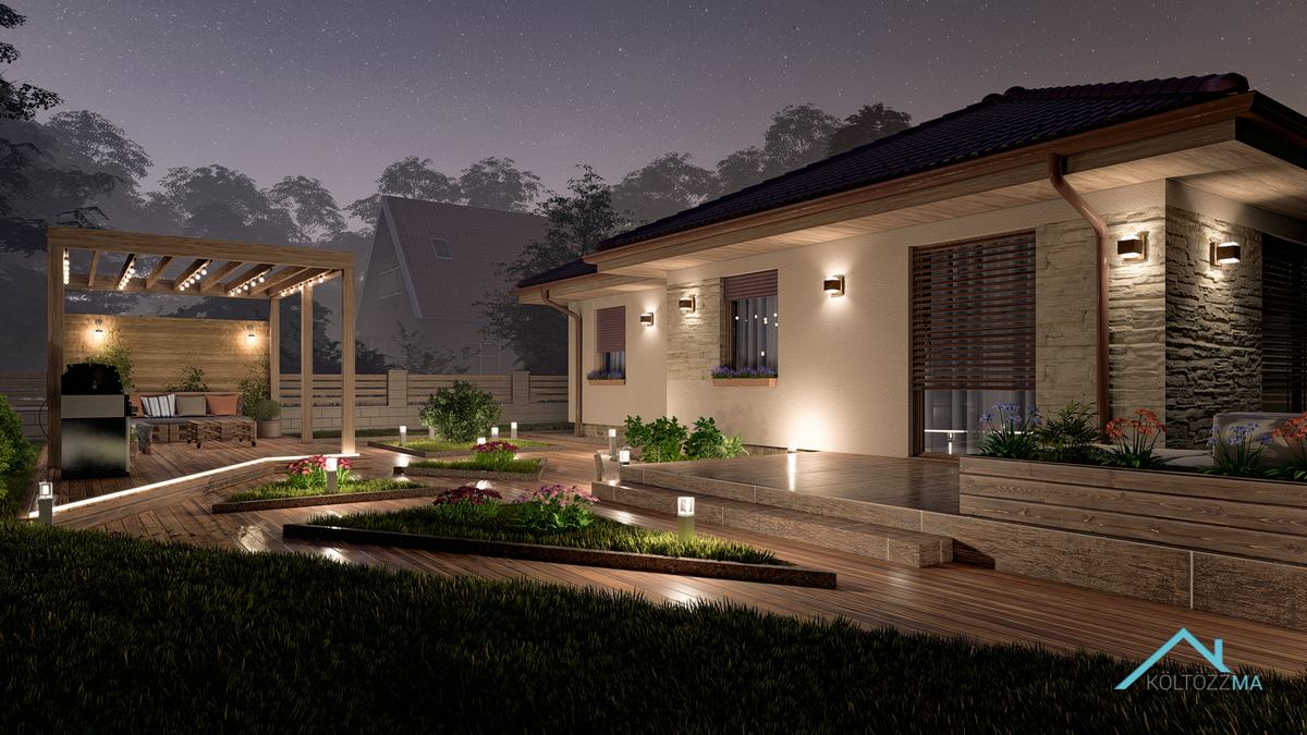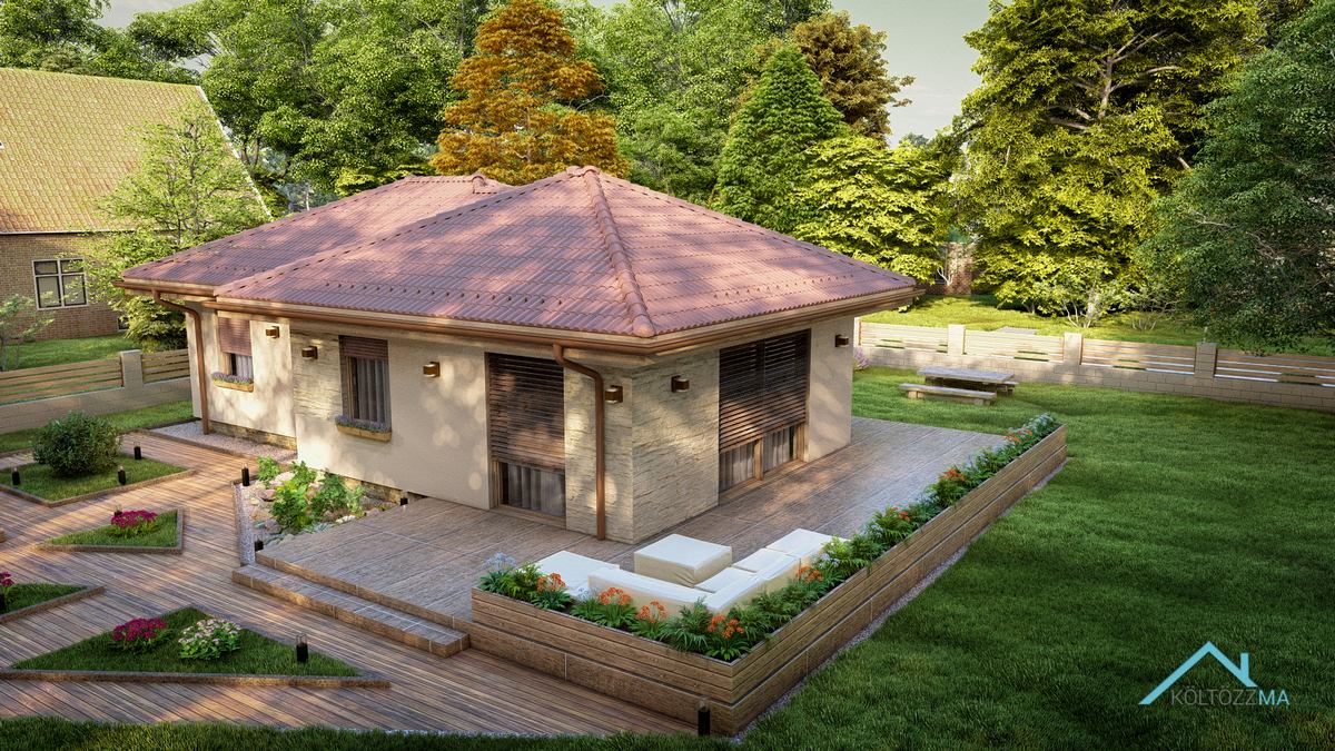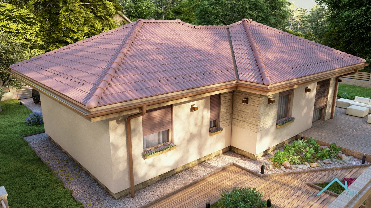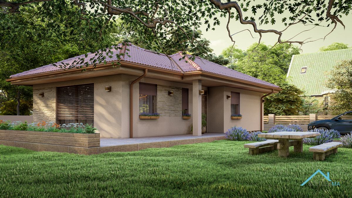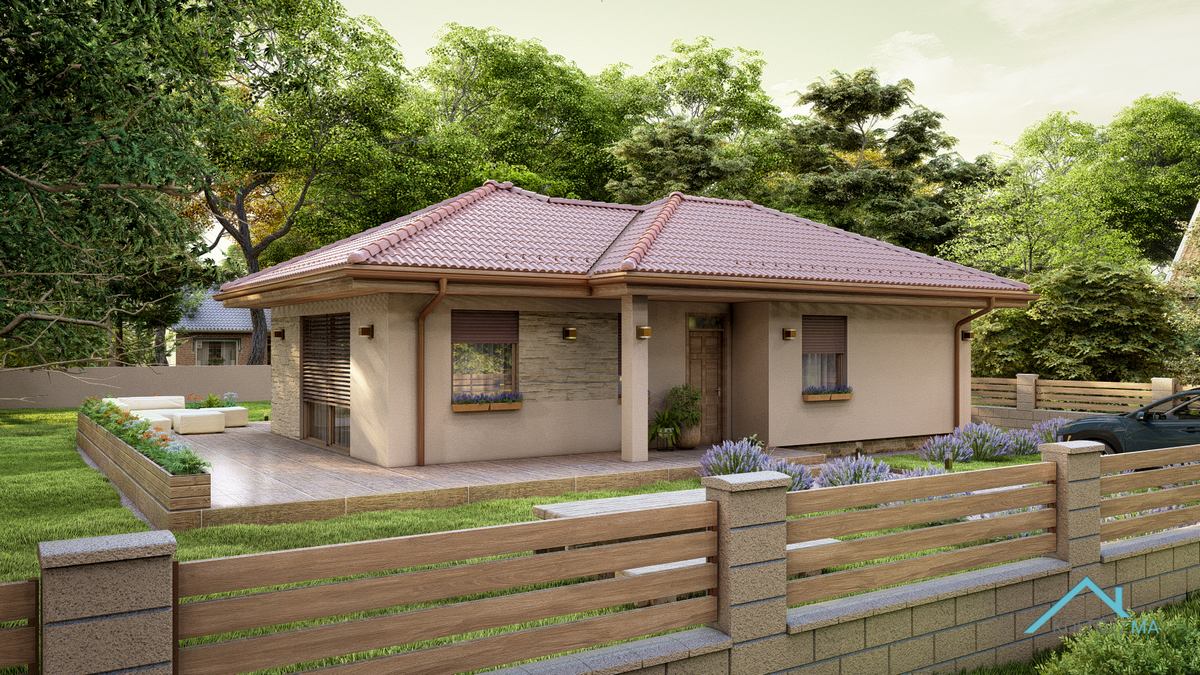 A San Marcos típusú ház mediterrán stílusban készült, tágas, jól kihasználható terekkel. A nettó 77 m² alapterületű épület három hálószobát kínál, mindegyik több mint 10 m²-es, így minden családtagnak megfelelő méretű privát teret biztosít. A 10 m²-es fürdő kényelmes használatot nyújt, a nappali-konyha-étkező pedig elegendő helyet biztosít a közös családi vagy baráti időtöltésre. A kamra praktikus megoldás a tárolásra, így minden szükséges holmi rendezetten elfér. Egy jól átgondolt, otthonos választás azoknak, akik kényelmes, de kisebb méretű házban gondolkodnak.
